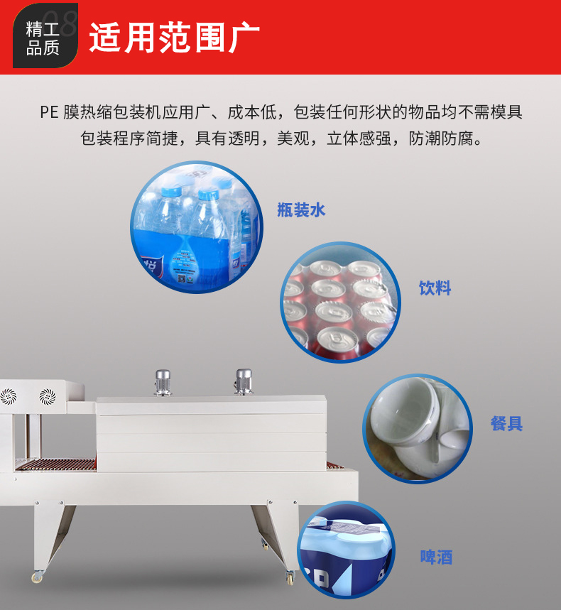 - 適用于中型規模的包裝生產線。其優勢在于加熱均勻、穩定,使用壽命長。在一些中型的食品、日用品生產企業中,不銹鋼加熱系統的 PE 熱收縮機能夠提供高質量的包裝效果,滿足一定批量產品的包裝需求。