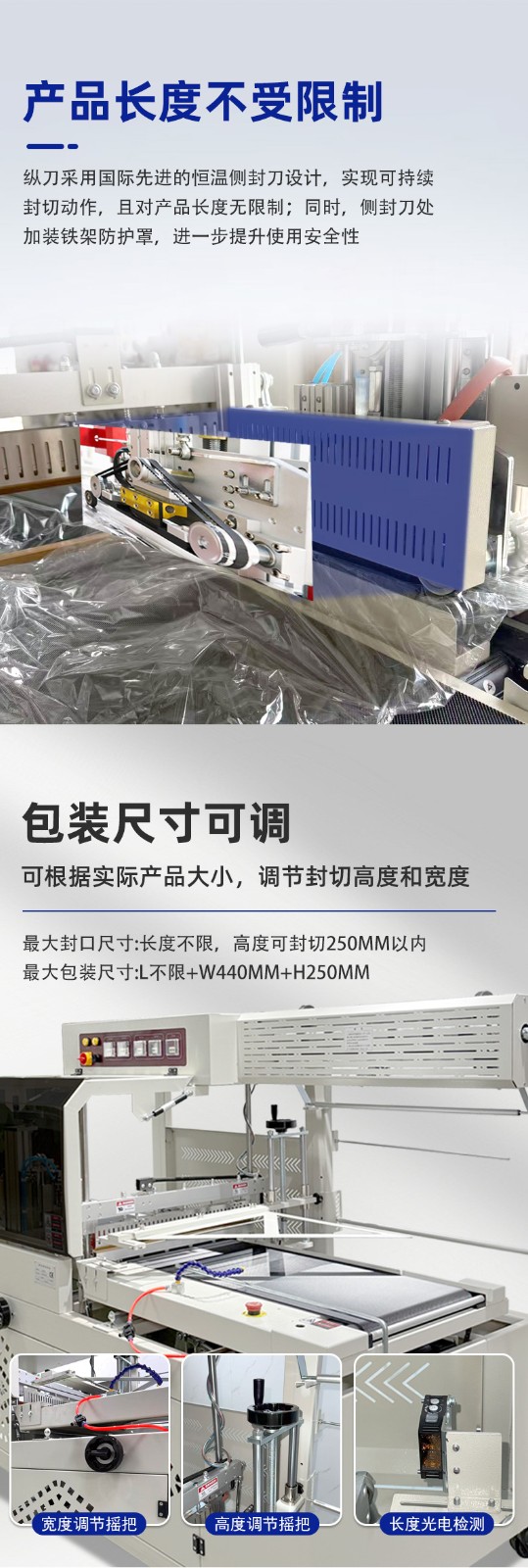 - 縱向高度:通過升降封切裝置或調(diào)整熱收縮隧道高度,適配 20-300mm 高的產(chǎn)品(如從包裝 5cm 高的便利貼到 25cm 高的桶裝零食);部分定制機(jī)型還可擴(kuò)展尺寸范圍,滿足大型產(chǎn)品(如小型家電、工具箱)的包裝需求,進(jìn)一步拓寬適用邊界。