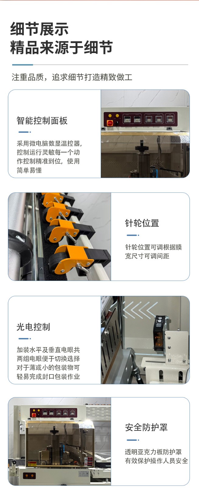 自動(dòng)化保護(hù)機(jī)制,保障運(yùn)行穩(wěn)定性設(shè)備內(nèi)置多重智能保護(hù)功能:當(dāng)薄膜用盡時(shí),機(jī)器會(huì)自動(dòng)停機(jī)并報(bào)警;封切刀溫度異常(過高 / 過低)時(shí),系統(tǒng)會(huì)實(shí)時(shí)監(jiān)測并觸發(fā)保護(hù),防止薄膜燙破或封合不牢固;進(jìn)料口無產(chǎn)品時(shí),送膜與封切工序會(huì)同步暫停,避免空膜浪費(fèi)。這些自動(dòng)化保護(hù)不僅減少設(shè)備故障風(fēng)險(xiǎn),也降低了人工巡檢的頻率,提升設(shè)備連續(xù)運(yùn)行的可靠性。