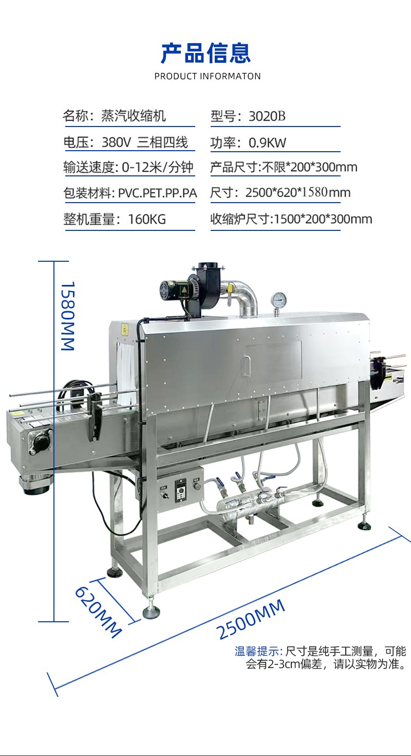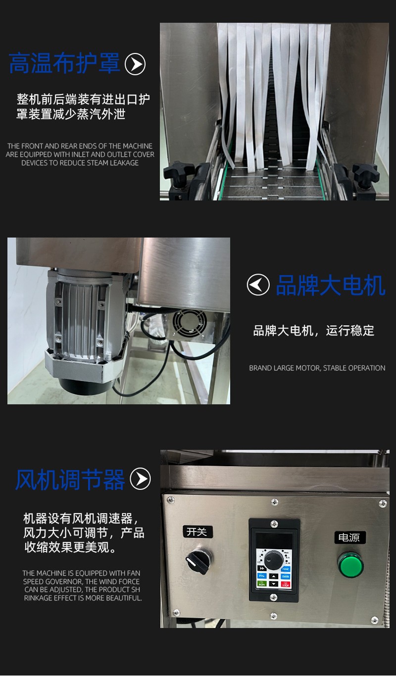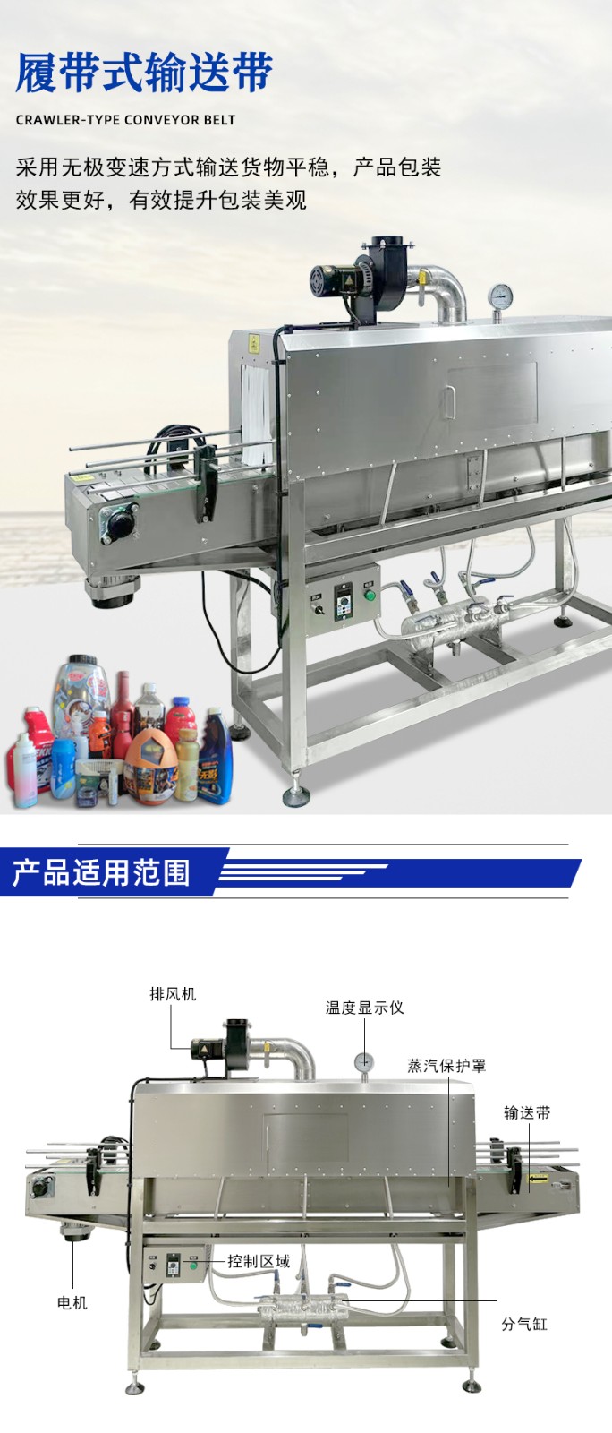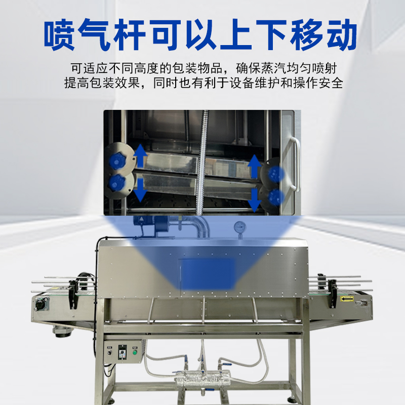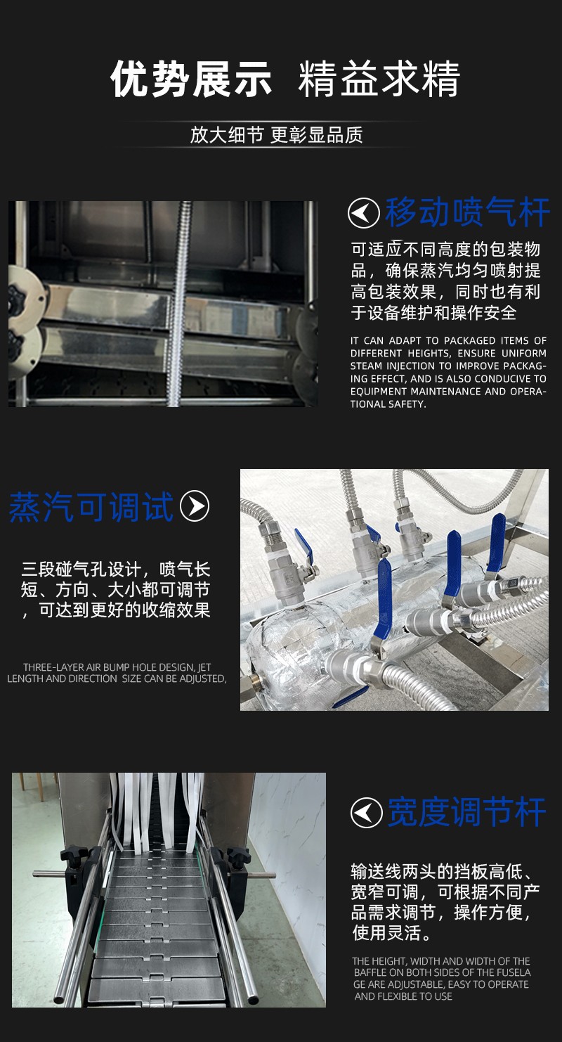 - 收縮通道:內(nèi)部設(shè)有蒸汽噴射孔或噴嘴,通道長度與寬度根據(jù)產(chǎn)品尺寸可調(diào),以確保蒸汽均勻覆蓋。