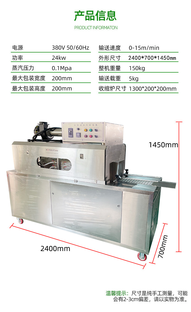 節能環保優勢:與單獨使用傳統包裝設備和收縮設備相比,蒸汽收縮一體機在能源利用上可能更高效。蒸汽收縮過程相對節能,而且一體機的集成設計減少了設備整體的能耗,同時也降低了對工作空間的要求,符合節能環保的理念。