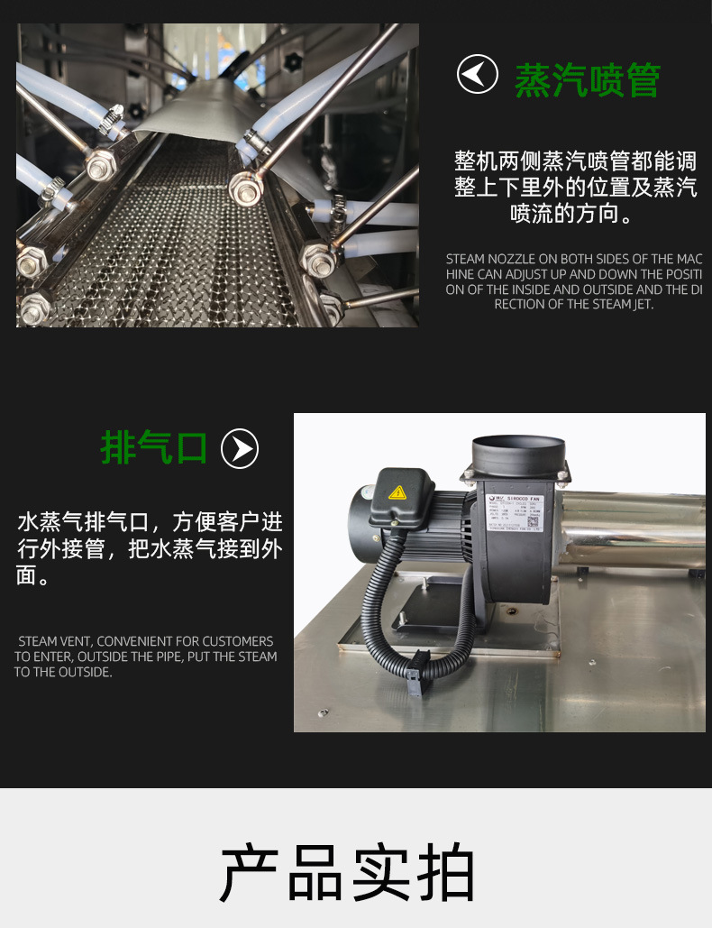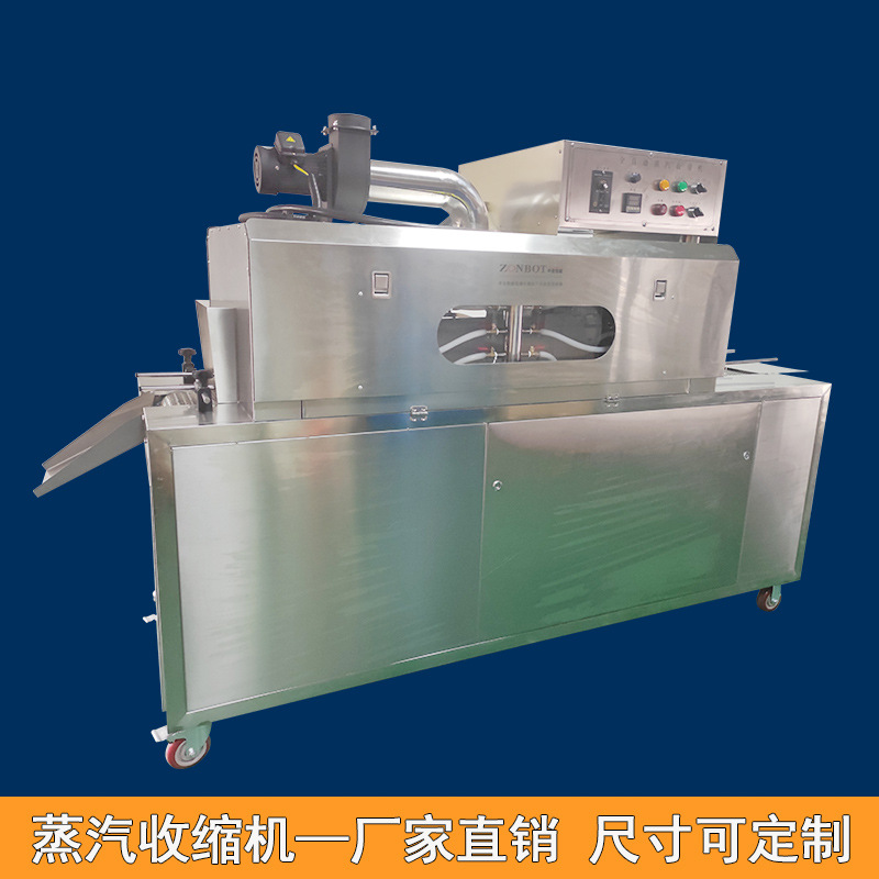 收縮階段:包裝好的產品接著被輸送到蒸汽收縮部分的收縮通道入口。此時,蒸汽發生系統已經產生了合適的蒸汽,蒸汽通過噴頭均勻地噴灑在產品的包裝薄膜上。包裝薄膜在蒸汽的熱量作用下開始收縮,緊密貼合在產品表面。產品在輸送系統的推動下繼續在收縮通道內移動,保證薄膜各個部分都能充分收縮。收縮完成后,通風口排出蒸汽,產品在外界環境下冷卻定型,最終完成蒸汽收縮包裝,從出口輸送帶送出一體機。