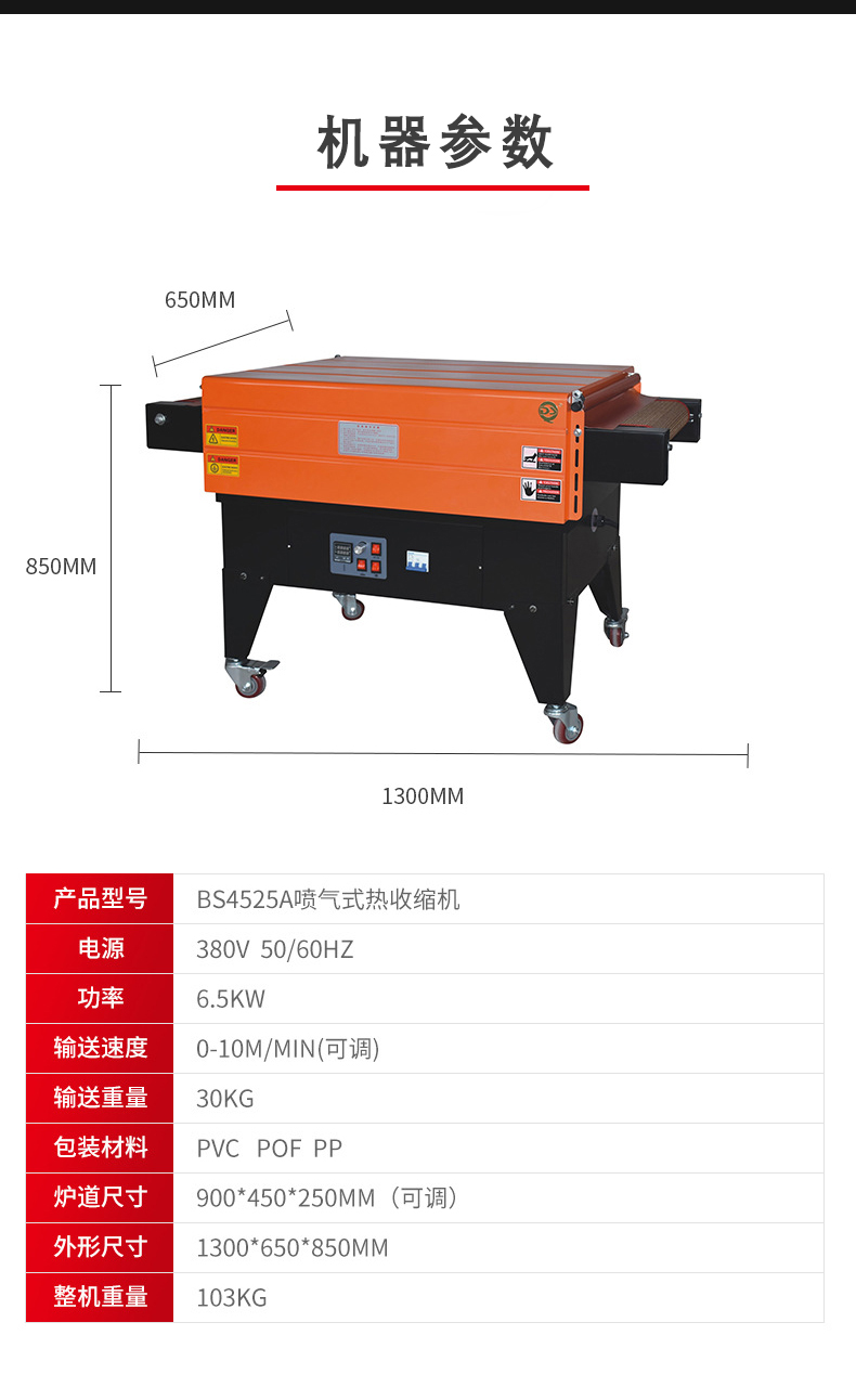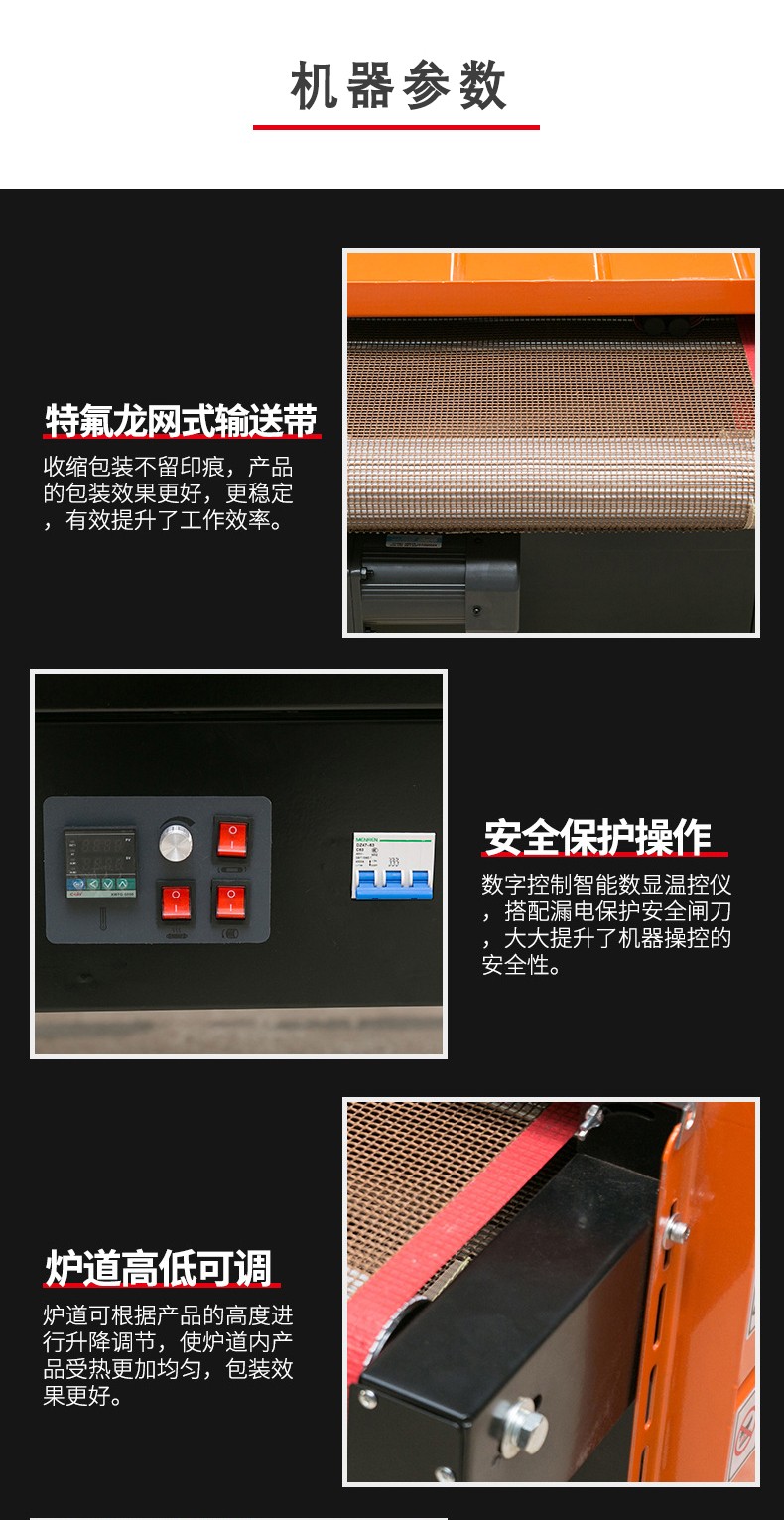 - 收縮溫度范圍:一般為 120 - 200℃。不同的熱收縮薄膜有不同的最佳收縮溫度,在選型時要考慮機器的溫度范圍是否能夠滿足所使用薄膜的要求。例如,PVC 薄膜的收縮溫度一般在 140 - 160℃,POF 薄膜的收縮溫度約為 160 - 180℃。