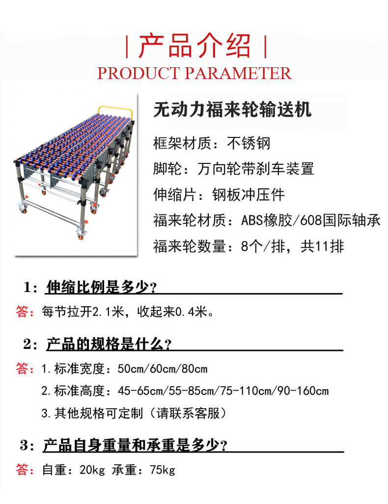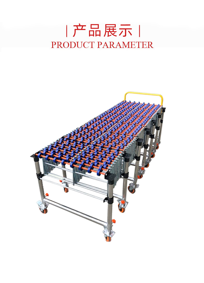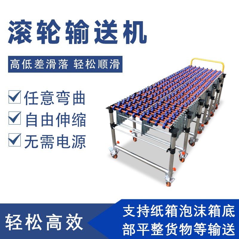 - 滾輪輸送機(jī)是一種利用滾輪的旋轉(zhuǎn)來輸送物品的設(shè)備。它可以分為無動(dòng)力滾輪輸送機(jī)和動(dòng)力式滾輪輸送機(jī)。無動(dòng)力滾輪輸送機(jī)主要依靠物品的自重或外力推動(dòng),如人工推動(dòng),使物品在滾輪上移動(dòng)。動(dòng)力式滾輪輸送機(jī)則配備電機(jī)等動(dòng)力裝置,通過傳動(dòng)系統(tǒng)帶動(dòng)滾輪旋轉(zhuǎn),從而自動(dòng)輸送物品。