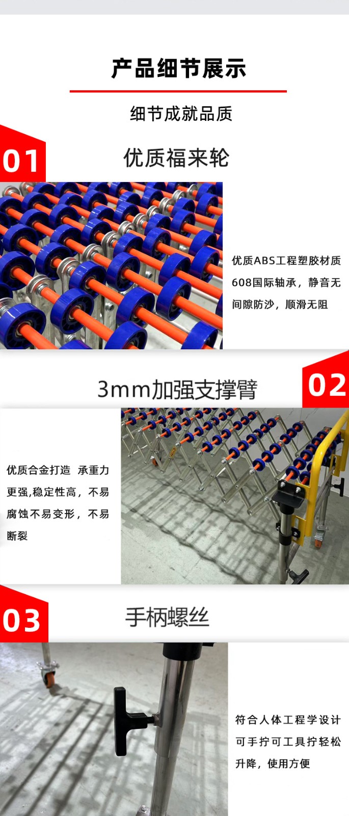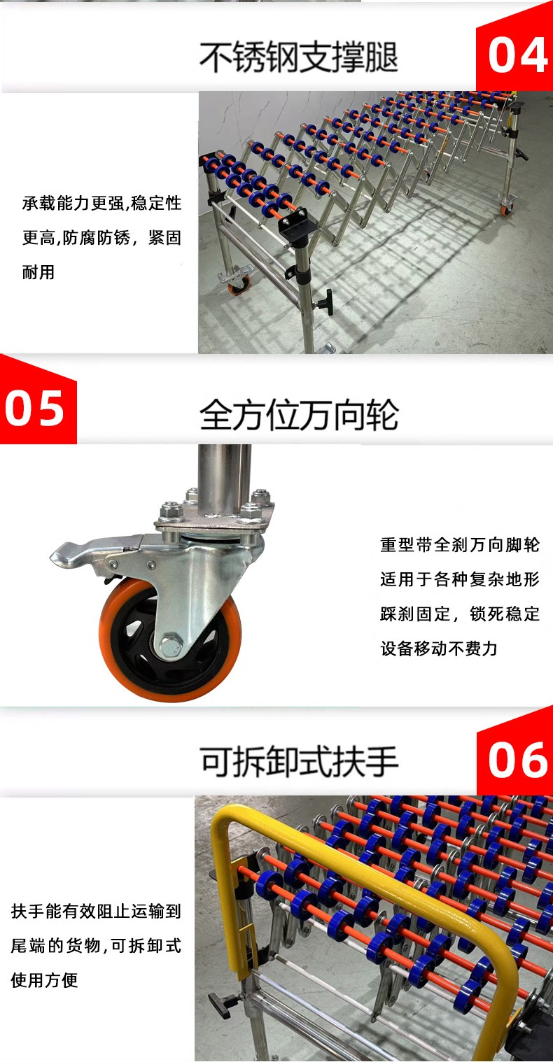 - 滾輪:這是核心部件,一般由金屬或塑料制成。金屬滾輪(如碳鋼、不銹鋼滾輪)具有較高的強(qiáng)度和承載能力,適用于較重物品的輸送;塑料滾輪(如聚氨酯滾輪)則具有較好的耐磨性和較低的噪音特性,常用于對(duì)噪音要求較高的場(chǎng)合。滾輪的直徑和寬度會(huì)根據(jù)輸送物品的大小和重量等因素來選擇。